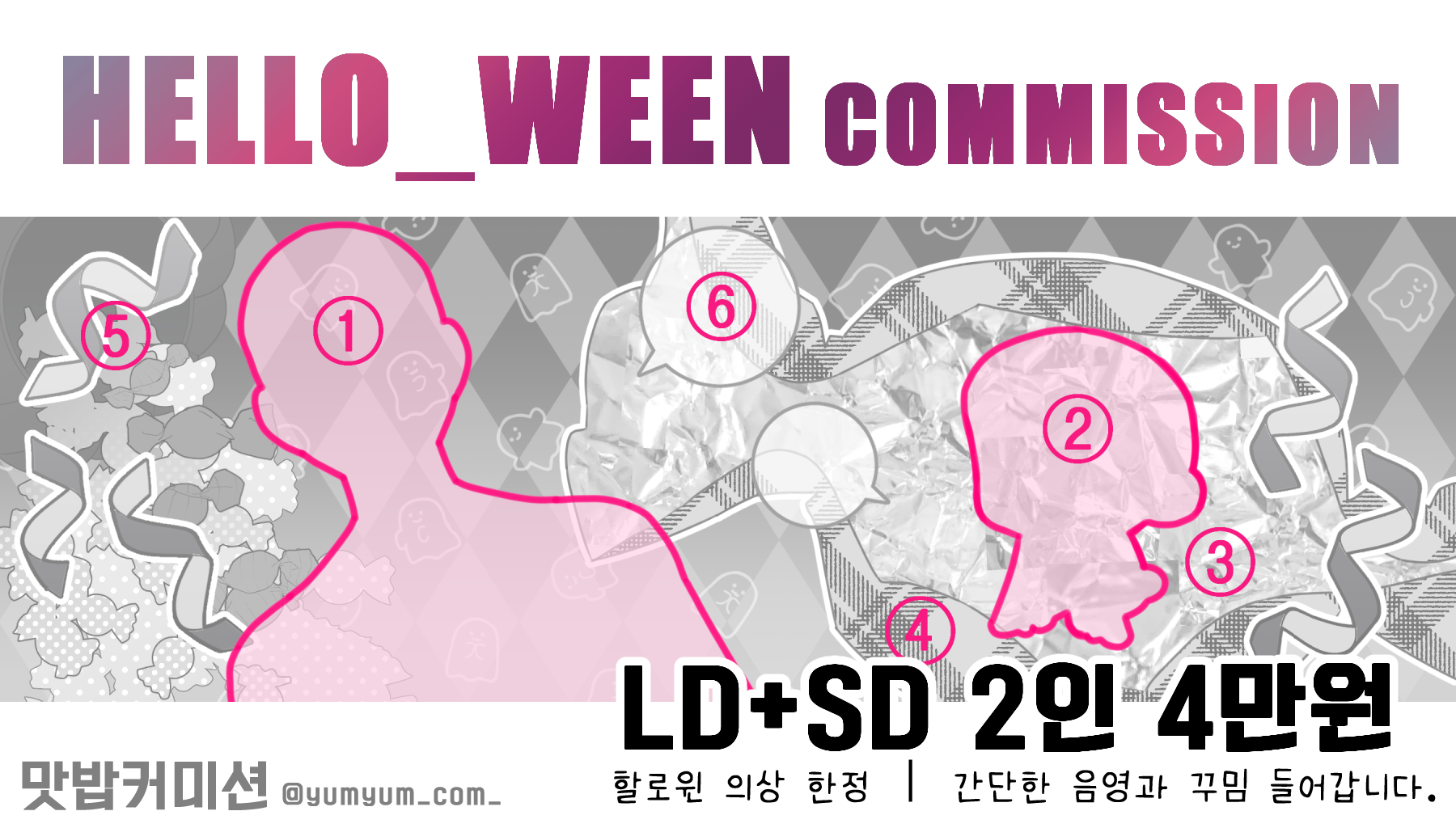 맛밥(@yumyum_com_) 헬로윈 타입 ( LD+SD 총 2인 / 간단 명암 + 꾸밈 (소품 2종 포함) / 무컨펌 / 자세 고정 ) 의 신청 양식입니다. 신청 전 다음 안내 사항을 참고해 주세요.